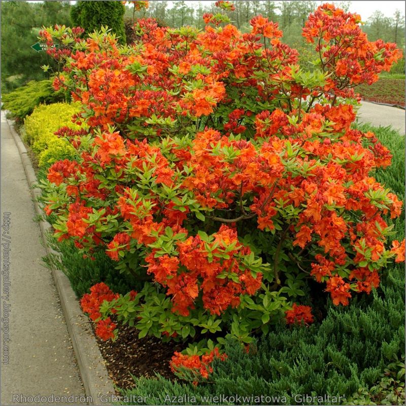 Tzv. dřevité - opadavé azalky patří spolehlivě k nejkrásnějším na jaře kvetoucím keřům. Odrůda Gibraltar dorůstá výšky asi 1,5 m a má vzpřímený habitus. Sytě oranžové květy, které kvetou od poloviny května do poloviny června, mají zkrácené okraje okvětních lístků. Opadavé azalky jsou vřesovištní rostliny, které na rozdíl od japonských azalek milují plné slunce za předpokladu, že mají trvale vlhkou, kyselou půdu s ph mezi 4-5. Dávají přednost lehké, nevápenité, propustné půdě s rašelinou, kompostem a povrchovým dřevitým mulčem. Těžké půdy se vylehčují přidáním písku a jemného boraxu. V těžkých jílovitých půdách je důležitá dobrá drenáž. Květní úbory odřízněte ihned po odkvětu. Kořeny nesmí nikdy vyschnout.
