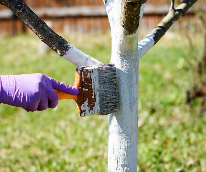 Odstraňte nesoudržné části kůry z kmene, naneste barvu štětcem nebo válečkem. Natřete celý kmen stromu až po spodní větve. Na suchý kmen naneste rovnoměrné množství barvy. K práci používejte čisté nářadí.