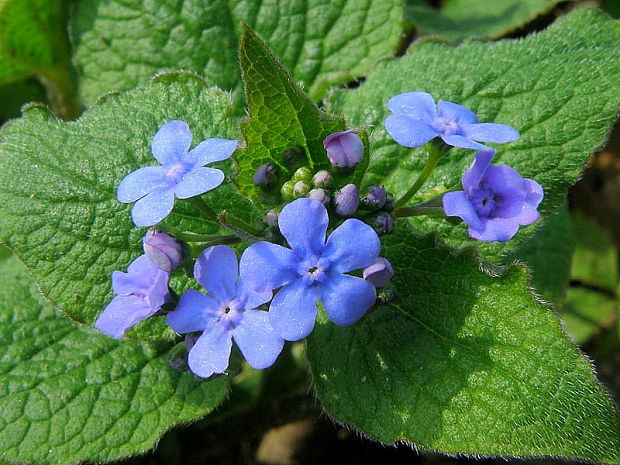 Původní druh brunera velkoplodá pochází z pohoří Kavkaz a severovýchodního Turecka. Roste zde ve stínu roklí a lesů v nadmořské výšce 500-1900 m. Základní druh se stejně jako většina kultivarů vyznačuje jemným světle modrým květem, který se objevuje brzy na jaře. Vyznačuje se téměř výhradně stříbrným listem s tmavě zeleným okrajem. Květ je rovněž kobaltově modrý, což vytváří příjemný kontrast.