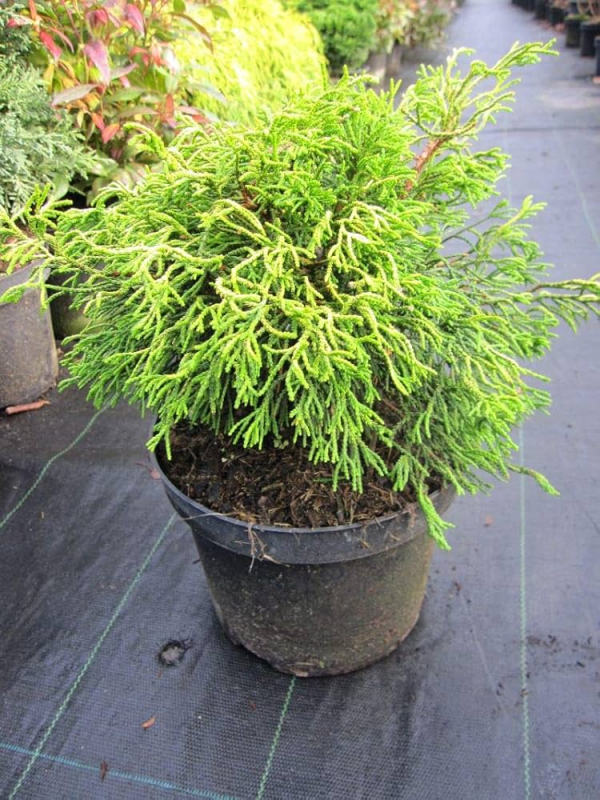 Zakrslý cypřišek s hustým, vějířovitým, zlatožlutým olistěním, rostoucí v zářivě světle zelené barvě se zlatými odstíny.