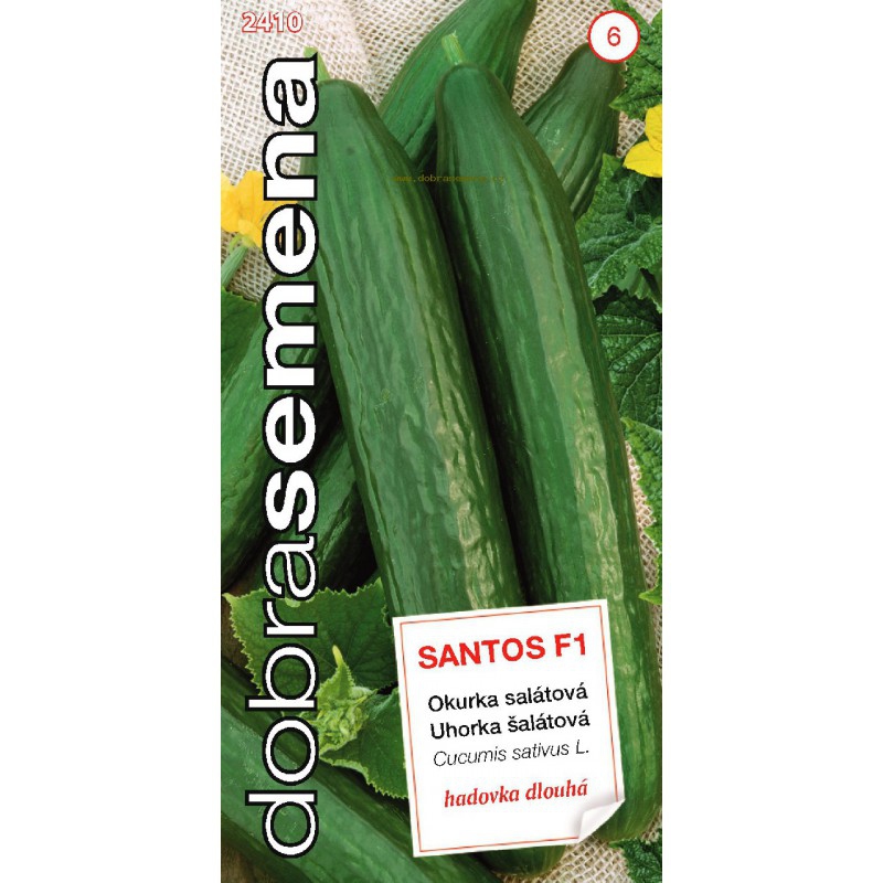 SANTOS F1 - dlouhá partenokarpická hadí okurka pro pěstování ve sklenících a polytunelích. Vysoce výnosný hybrid pro jarní a podzimní pěstování se 100% samičími květy. Plody jsou 30-35 cm dlouhé, hladké, s krátkým krčkem, geneticky nehořké. Rostlina je odolná vůči kladosporióze a tolerantní k viru okurkové mozaiky.