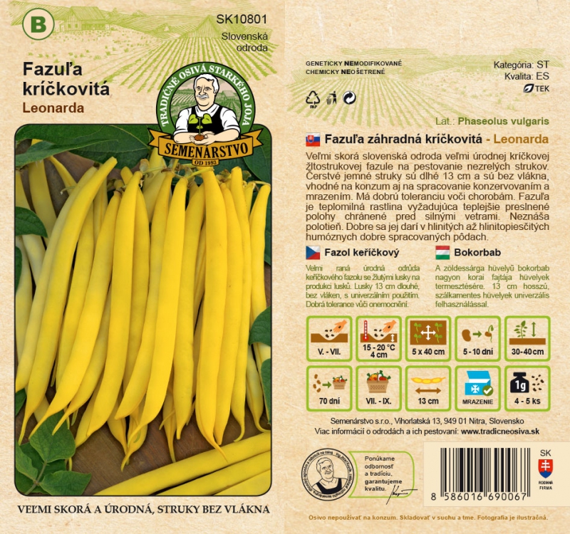 Velmi raná slovenská odrůda velmi úrodných keříčkových žlutých fazolí pro pěstování nezralých lusků. Čerstvé jemné lusky jsou 13 cm dlouhé, bez vláken, vhodné ke konzumaci i ke zpracování konzervováním a mražením. Má dobrou odolnost vůči chorobám. Fazol je teplomilná rostlina, vyžaduje teplejší, chráněnou polohu před silnými větry. Nesnáší částečné zastínění. Daří se jí v hlinitých až hlinitopísčitých, humózních, dobře obdělávaných půdách.