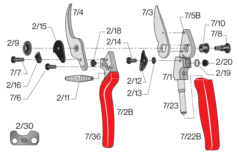 Felco 7 - ergonomický model s vylepšenou otočnou rukojetí. Pro snížení síly vyvíjené při stříhání a prevenci zánětu šlach je stříhací hlava nůžek zkosená. Nůžky Felco 7 jsou vybaveny otočnou rukojetí, která snižuje vynakládanou sílu o 30 %, takže stříhání je ještě pohodlnější.