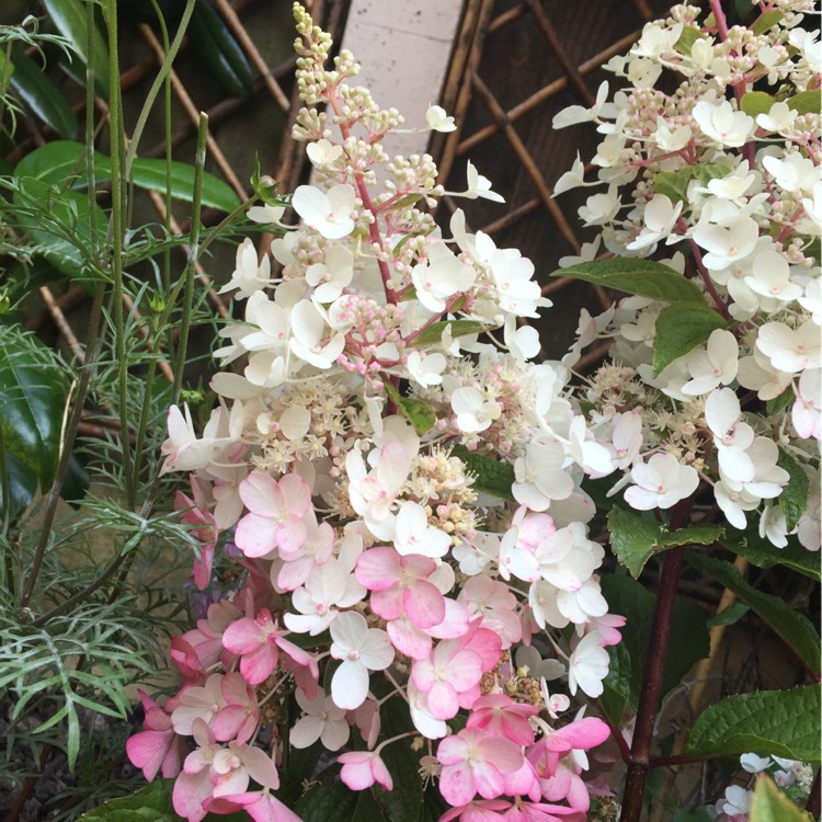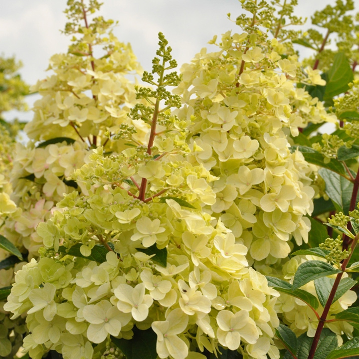 Hortenzie s velkými květenstvími krémově žluté barvy, která se časem mění na sytě růžovou.
