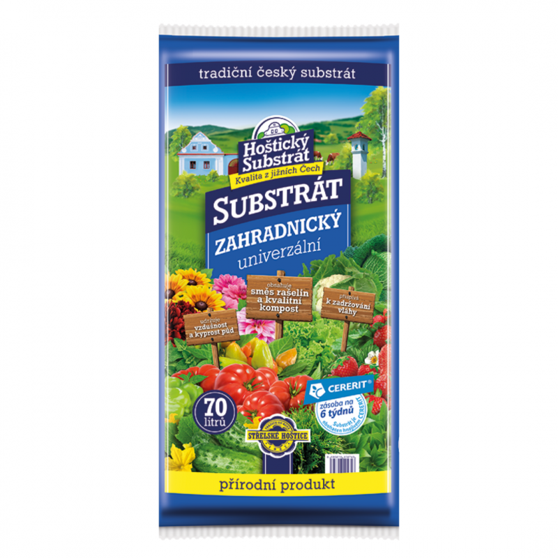 Hostický zahradnický substrát je vyroben ze směsi světlé a tmavé rašeliny, kvalitního tříděného kompostu a obsahuje minerální vícesložkové hnojivo Cererit. Díky svému jedinečnému složení zachovává kyprost a vzdušnost půdy a zaručuje tak dobrý růst, bohatou tvorbu kořenů a květů u všech druhů rostlin. Tím, že zadržuje sluneční paprsky, umožňuje lepší využití tepla pro růst rostlin, urychluje zakořeňování a přispívá k udržení vláhy. Zahradnický substrát se používá k okopávání květin a zeleniny, výsadbě okrasných a ovocných stromů a keřů ve volné půdě i v nádobách. Obsahuje potřebné množství základních a stopových živin pro prvních 6 týdnů výsadby
