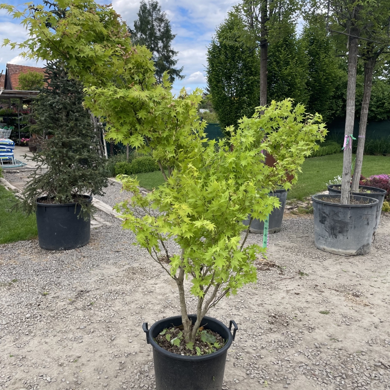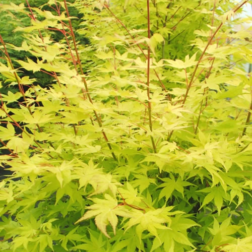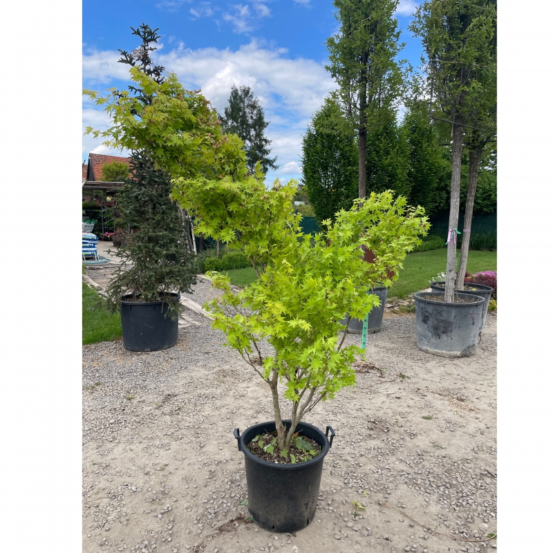Výjimečný javor, který si drží jasně žlutozelené listy až do podzimu, kdy se zbarví do sytě červené barvy.