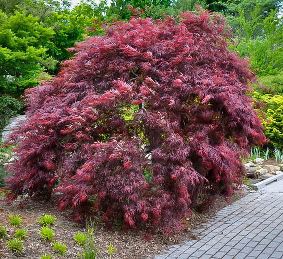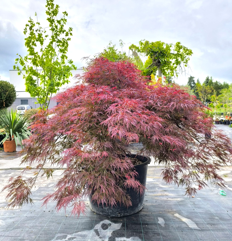 Je těžké uvěřit, že holé větve kultivaru Inaba Shidare, které vidíte v zimě, mohou v sezóně vytvořit tolik nádhery. Opravdu výjimečné je olistění tohoto javoru, které vypadá jako načechraný účes rusovlasé dámy. Zpočátku hnědočervené, hluboce skvrnité listy se mohou během léta změnit na sytě vínovou barvu, která se na podzim změní na jasně zářivou červenou. Hlavní kmen roste vzpřímeně, ostatní větve rostou do stran, což mu propůjčuje převislý, kaskádovitý vzhled. Dává přednost kyselé půdě, vlhké - ne přemokřené, propustné.