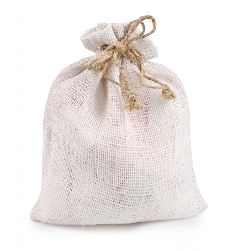 Dárkový pytel z krémové juty se snadno uzavírá pomocí stahovací šňůrky.