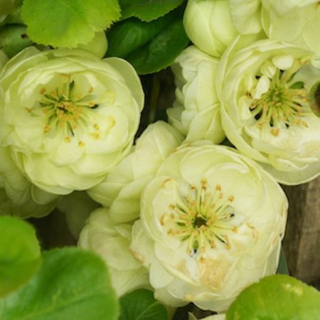 Kinshiden je jedinečná odrůda trpasličího trpaslíka s velkými, poloplnými květy světle zelenožluté barvy. Otevírají se brzy na jaře s příchodem teplejšího počasí, obvykle od poloviny dubna, ale pokud je teplá pozdní zima, můžete vidět poupata otevřená již v březnu. Kvetou poměrně dlouho, keře kvetou ještě v květnu. Po odkvětu se tvoří roztomilé, neforemné, ale velmi aromatické zelenožluté plody, spíše na starším dřevě uvnitř keře. Dozrávají v říjnu.