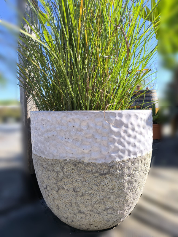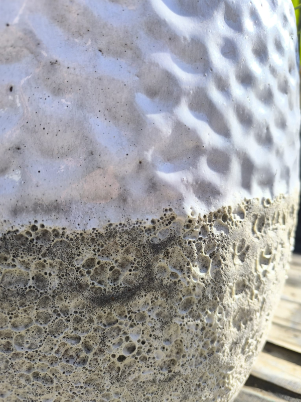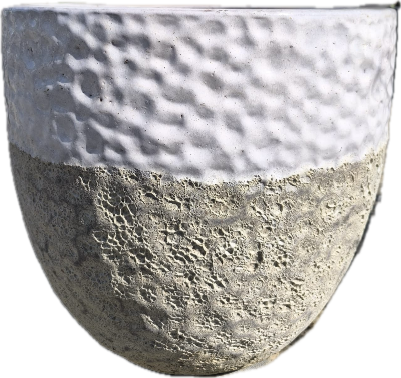 Moderní dvoubarevný keramický květináč s kombinací bílé glazury a přírodního strukturovaného povrchu. Díky svému stylovému vzhledu je vhodný jak do interiéru, tak na terasu a je ideální pro pěstování květin, travin nebo menších okrasných rostlin.