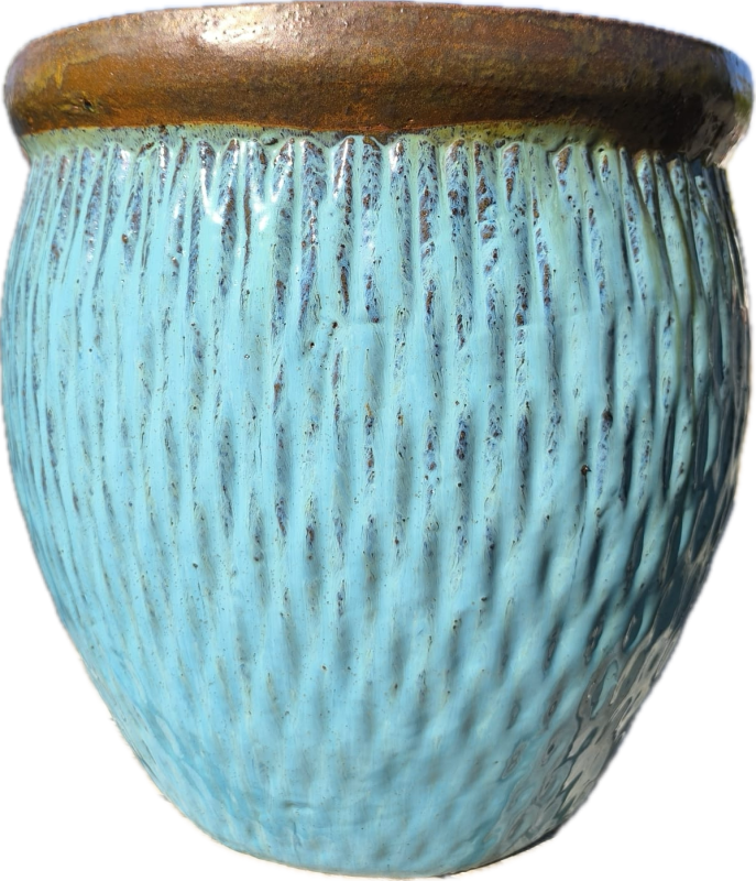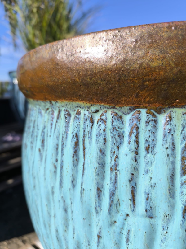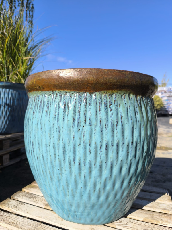 Dekorativní keramický květináč v tyrkysově modré barvě s rustikálním hnědým okrajem. Díky svému elegantnímu designu je vhodný pro pěstování květin, travin nebo menších dřevin a bude stylovým doplňkem terasy nebo interiéru.