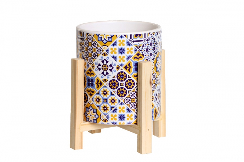 Balení s mozaikovým vzorem a dřevěným stojanem.