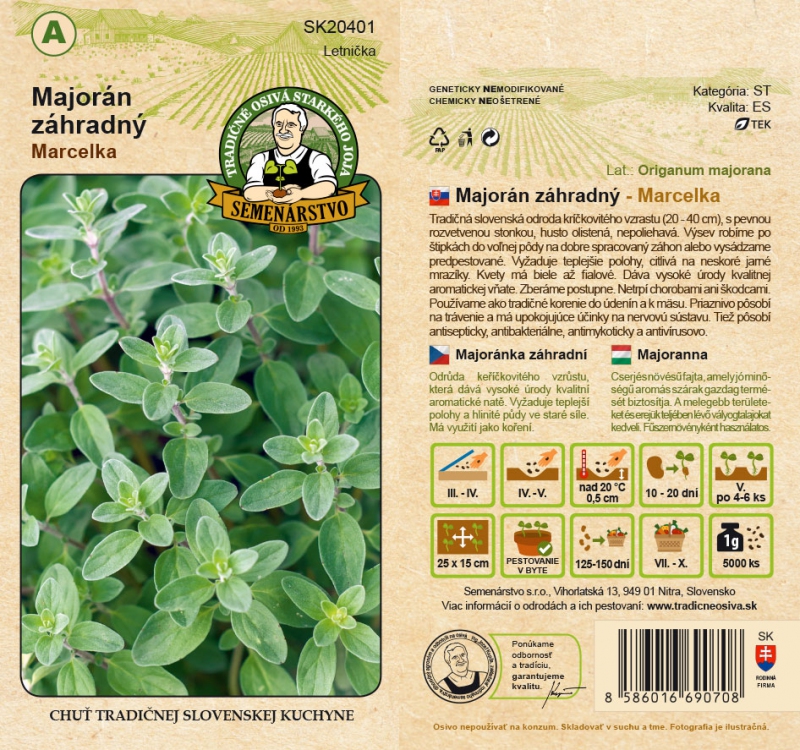 Tradiční slovenská odrůda keřovitého vzrůstu (20 - 40 cm), se silně rozvětveným stonkem, hustě olistěná, nepopínavá. Vyséváme po špetkách do volné půdy na dobře připravený záhon nebo vysazujeme předpěstované. Vyžaduje teplejší polohy, citlivá na pozdní jarní mrazíky. Květy jsou bílé až fialové. Vytváří vysoké výnosy kvalitních aromatických listů. Sklízejte postupně. Netrpí chorobami ani škůdci. Používáme ji jako tradiční koření do klobás a masa. Působí dobře na trávení a má uklidňující účinky na nervovou soustavu. Působí také antisepticky, antibakteriálně, protiplísňově a antivirově.