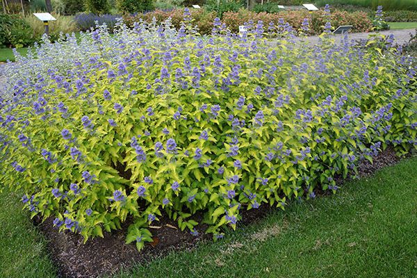 HINT OF GOLD nabízí mimořádně atraktivní zbarvení listů. Jsou nápadně větší , nabízejí vítané zpestření v záhonech s nízkými keři a jehličnany tmavě zelených barev. Jsou opadavé, zvláštně aromatické a na dotek jemně plstnaté. Květy se objevují od poloviny léta do poloviny podzimu a jsou úhledně seskupeny ve vyšších patrech stonků a na jejich vrcholu. Mají středně fialovou barvu a jsou to drobné trubičky ukrývající hojnost nektaru pro čmeláky, motýly a podobné lahůdky, které keř obléhají od úsvitu do soumraku.