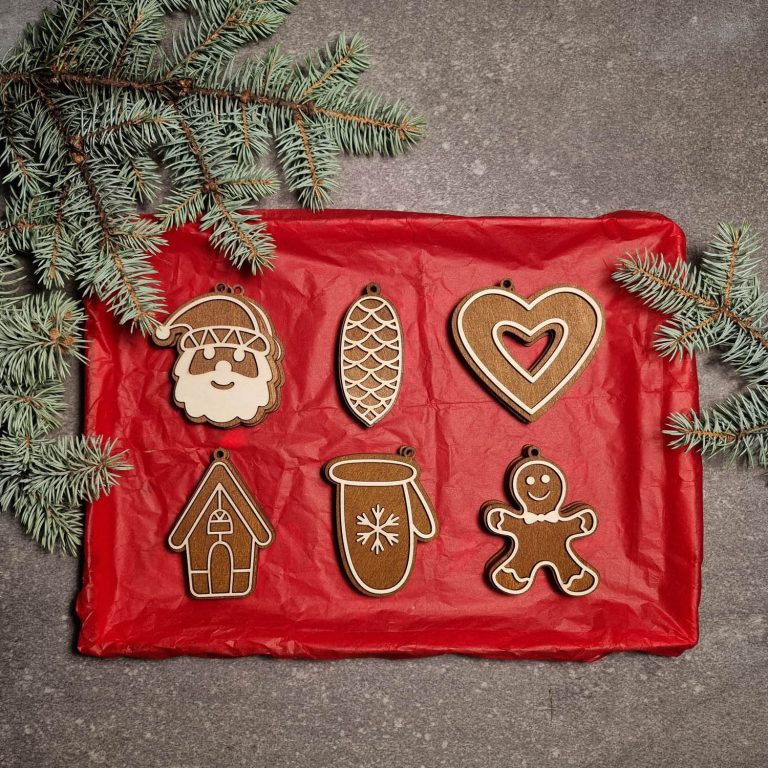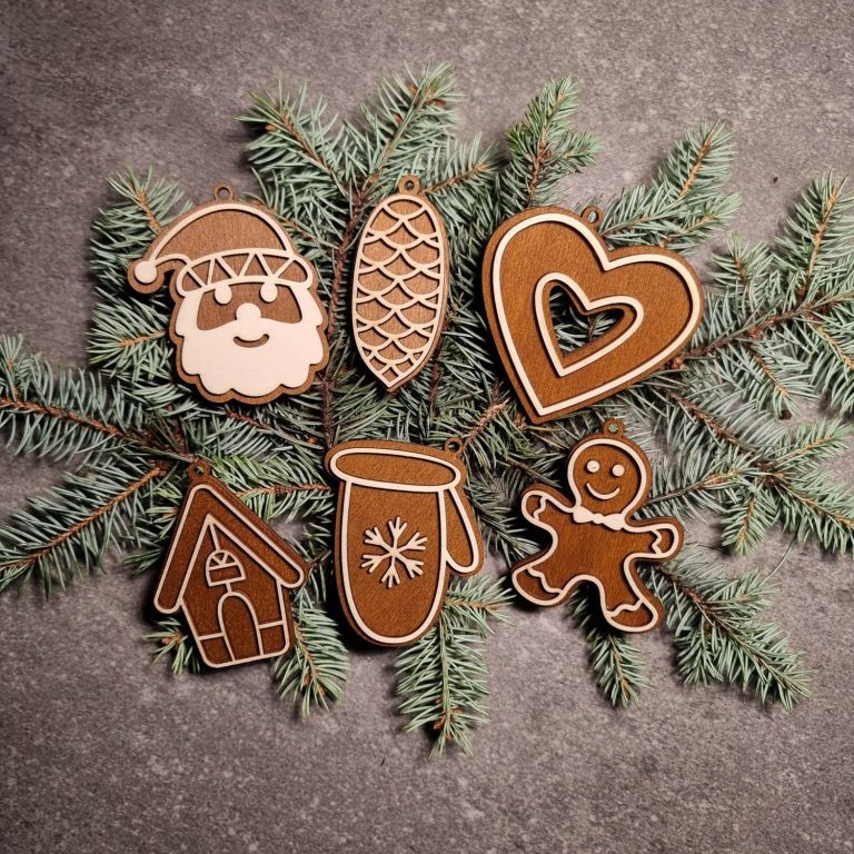 Laserem vyřezávané ornamenty z kombinace mořené a nemořené překližky.