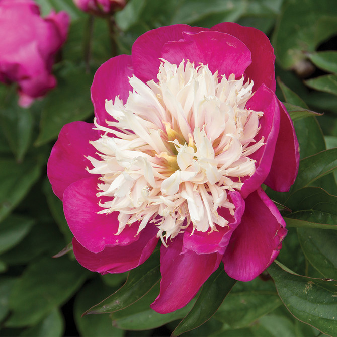 Pivoňka s bílou čepičkou má velké, růžovočervené květy s mnoha krémově bílými jehlicovitými okvětními lístky uprostřed, které mohou později v sezóně zrůžovět. Ohromující kontrast červené a bílé barvy září v zahradě a přitahuje pohledy návštěvníků.