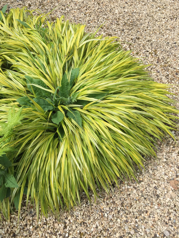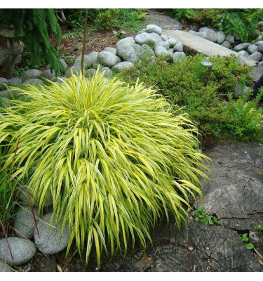 Hakonechloa macra Aureola patří již dlouho k nejoblíbenějším kultivarům okrasných trav. Je ceněna zejména pro svůj hustý habitus a spolehlivý růst, kdy může tvořit i souvislejší habitus v podrostu. Listy mají střídavě podélné žluté a zelené pruhy. Na podzim dominuje výrazná zlatá barva.