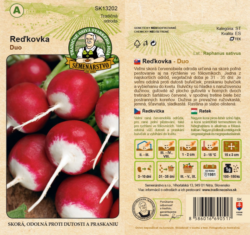 Velmi raná červenobílá odrůda pro rané polní pěstování a rychlení ve sklenících. Jedna z nejranějších odrůd, vegetační doba je 31-35 dní. Je velmi odolná vůči dutosti cibulí, praskání cibulí a boltci. Hlízy jsou hladké s narůžovělou dužninou, v horních dvou třetinách kulovité až ploše kulovité, šarlatově červené, ve spodní třetině bílé, bez postranních kořenů. Dužnina je převážně narůžovělá, křehká, šťavnatá, nasládlá. Rostlina je slabě opadavá