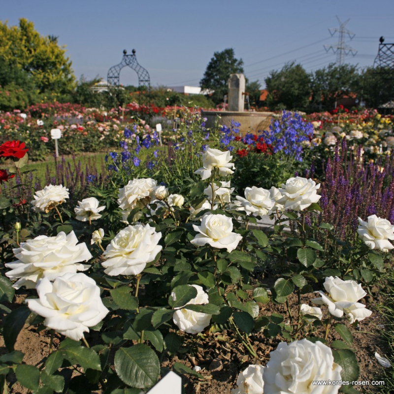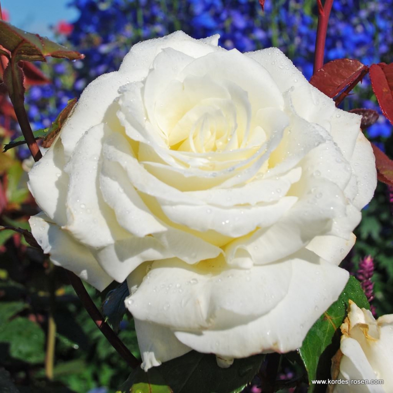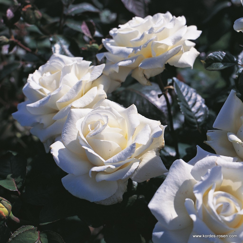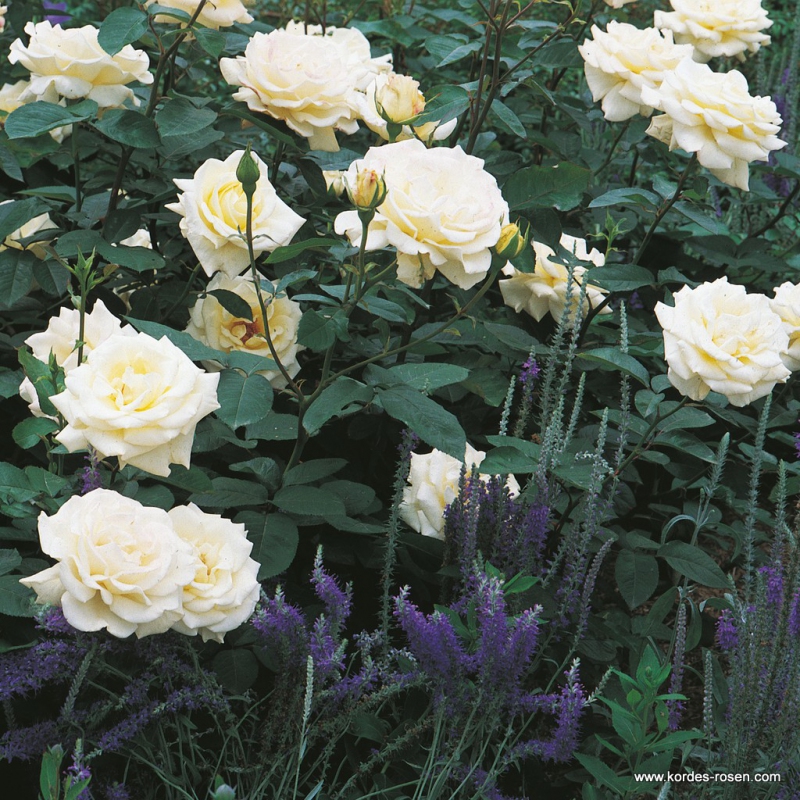 Typická "svatební růže", krémová a bílá. Je to kompaktní květ s krásnou vůní čajovníku, která kontrastuje s tmavě zelenými listy.