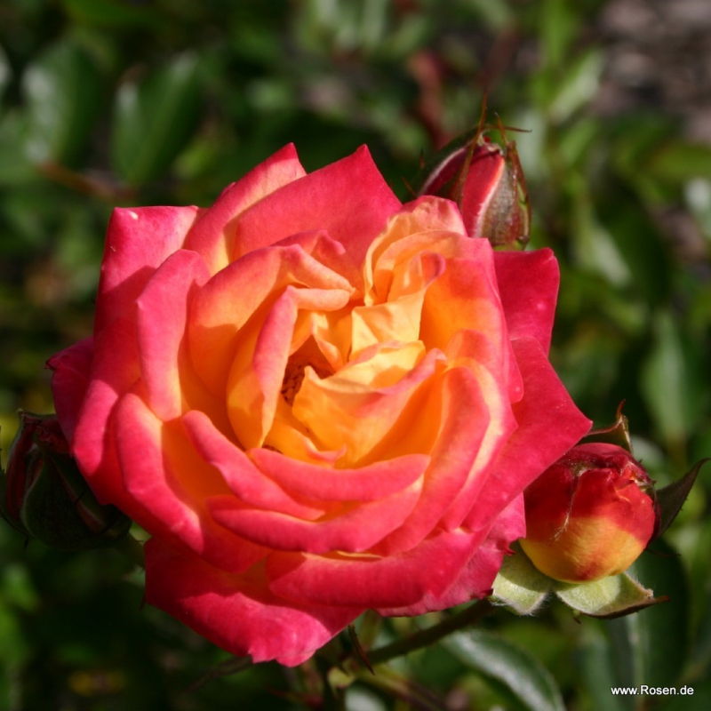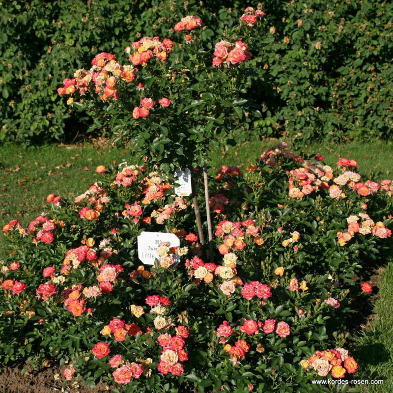 Miniaturní růžice v atraktivní kombinaci barev květů se žlutými středy a červenými okraji okvětních lístků, výborná i do nádob.