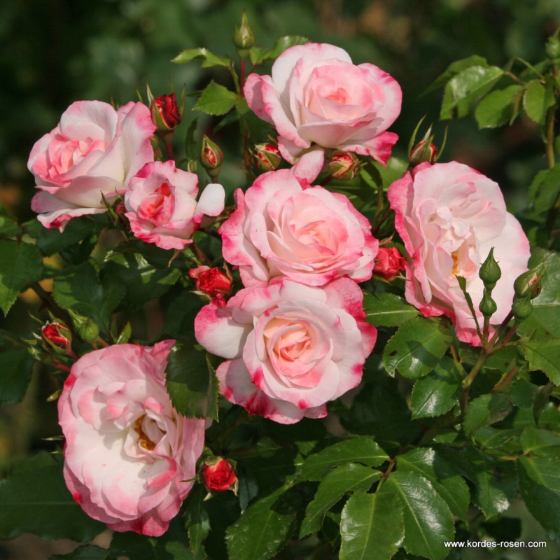 Ušlechtilý tvar poupat, jemná vůně a neobvyklá kombinace dvou barev - bílé a červené. Postupně rozkvétá do růžových tónů.