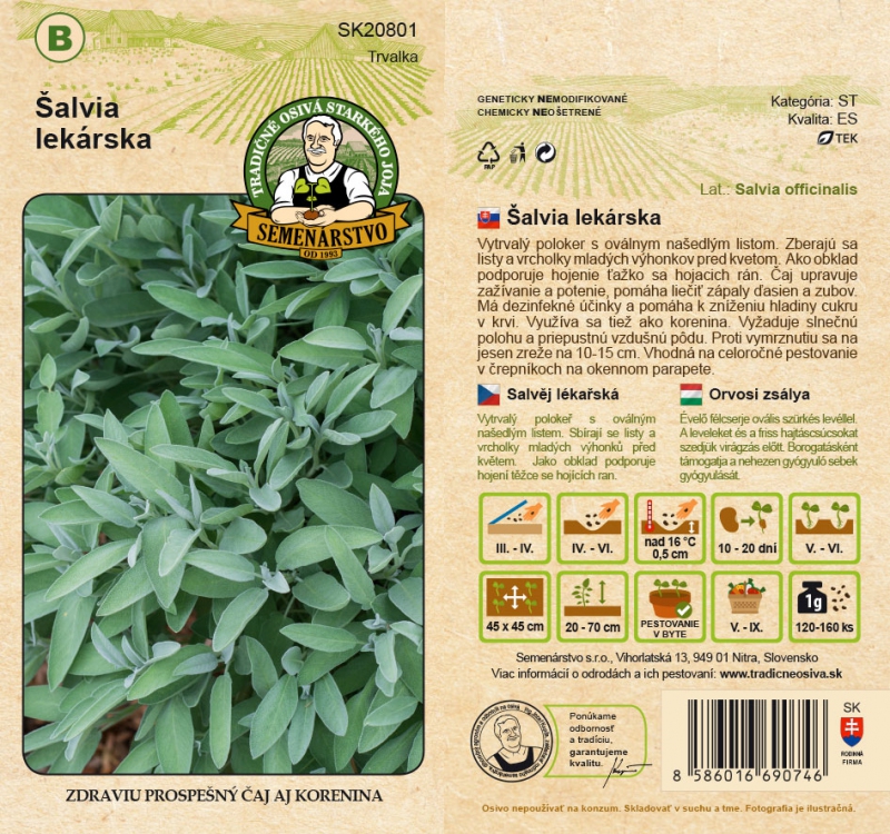 Poléhavý polokeř s oválnými šedavými listy. Listy a vrcholky mladých výhonů se sklízejí před květem. Jako obklad podporuje hojení těžko se hojících ran. Čaj reguluje trávení a pocení a pomáhá léčit záněty dásní a zubů. Má dezinfekční účinky a pomáhá snižovat hladinu cukru v krvi. Používá se také jako koření. Vyžaduje slunné stanoviště a propustnou vzdušnou půdu. Na podzim se seřezává na 10 až 15 cm, aby nevymrzla. Hodí se pro celoroční pěstování v květináčích na okenním parapetu.
