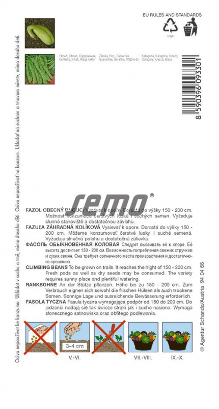 Odrůda pozdních tyčkových zelených fazolí. Lusky jsou typu Supermarconi a dorůstají velikosti až 21 cm. Lusky jsou velmi ploché, zelené barvy. Semena jsou plochá, oválného tvaru a černé barvy. Fazole jsou určeny ke sklizni lusků pro čerstvou spotřebu a konzervování.