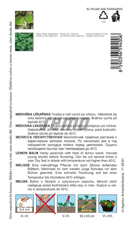 Trvalá bylina se čtyřhranným oddenkem a protilehlými vejčitými listy. Listy se sklízejí a rychle suší při teplotách do 40°. Éterická olejová droga s citronovou vůní a výrazným sedativním účinkem na nervový systém. Používá se v čajových směsích k léčbě zažívacích potíží a při vyčerpání spojeném s nespavostí. Má uklidňující účinek.