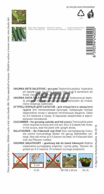 Velmi kvalitní, středně pozdní hybrid pro polní pěstování. Má bujný růst. Plody jsou menší, sytě tmavě zelené, štíhlé, téměř bez krčku, zřídka deformované, geneticky nehořké. Má vynikající zdravotní stav, vitalitu, výbornou mrazuvzdornost a regenerační schopnost. Je vhodná i pro pozdní výsevy. Kvete pouze samičími květy, proto je nutné k osivu přidávat opylovače (MIX, barevně odlišené barvením). Je odolná proti CMV a černé okurce, netrpí padlím. Vegetační doba je 83 dní, celková doba pěstování až 130-140 dní. Z 10 m² je možné sklidit 45-50 kg na poli, 140-150 kg ve fóliovníku.