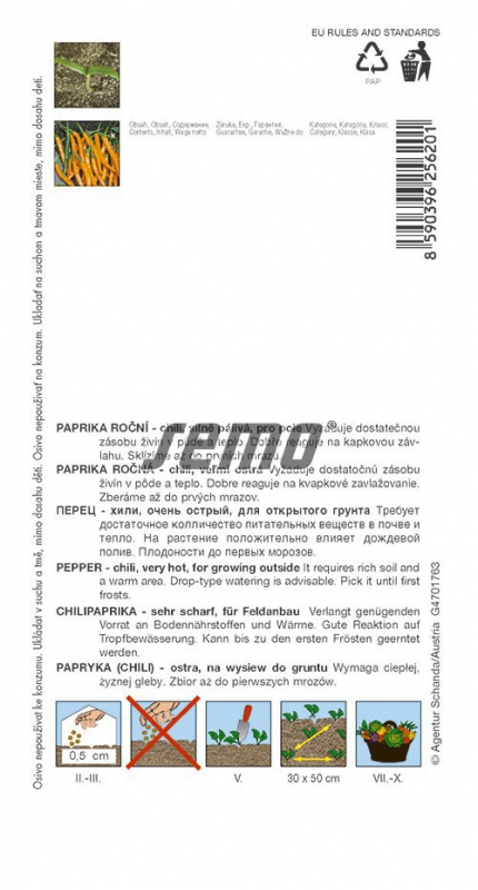 Oranžové chilli papričky pro pěstování na poli, ve sklenících i ve sklenících, středně dlouhé, tenké plody. Rostliny vyžadují teplo a dostatečný přísun živin. Dobře reagují na kapkovou závlahu. Vhodné také pro pěstování v nádobách. SHU 45 000 - 55 000.