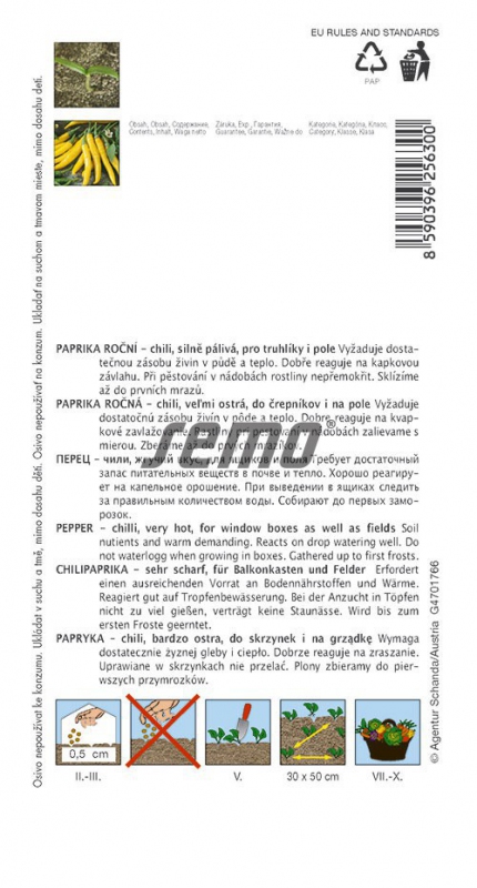 Žluté chilli papričky pro pěstování na poli, ve sklenících i ve sklenících, středně dlouhé, tenké plody. Rostliny vyžadují teplo a dostatečný přísun živin. Dobře reagují na kapkovou závlahu. Vhodné také pro pěstování v nádobách. SHU 50 000 - 60 000.