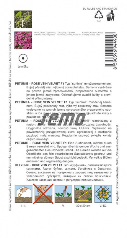Petunie typu Surfinia Rose Vein Velvet F1 je nová petunie s velkým převisem typu Surfinia, od šlechtitelské české firmy Petunia Černý z Jaroměře. Růžové květy mají tmavě růžové žilkování ve vejcovodu květu. Bohatý převis, dlouhé kvetení a odolnost vůči rozmarům počasí jsou přednostmi této odrůdy. é
