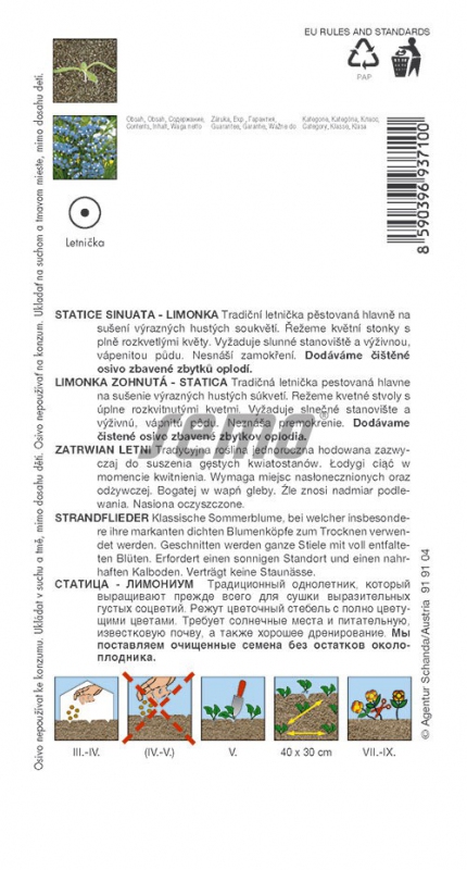 Přímé, hustě větvené jednoleté rostliny určené především k sušení. Vytváří přízemní růžici kopinatých laločnatých listů a drobných květů v hustých květenstvích na křídlatých stoncích. Květní stvoly se sklízejí postupně (plně odkvetlé) a suší se ve stínu. Čerstvé květy lze použít i k řezu, do vázy. Vyžaduje plně osluněné stanoviště, v polostínu kvete špatně. Nesnáší přemokření. Světle modrá, výška 70 cm.
