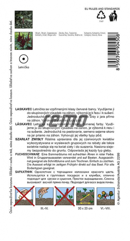 Rychle rostoucí jednoletka se vzpřímenými květními klasy sytě červené barvy. Vynikající pro smíšené záhony, k řezu, do váz a k sušení. Vysévá se přímo na pozemek, výjimečně je možné předpěstovat sazenice. Laskavec není náročný na stanoviště, vyhovují mu vlhčí, dostatečně vododržné půdy a plné slunce. Dorůstá do výšky 40 až 60 cm.