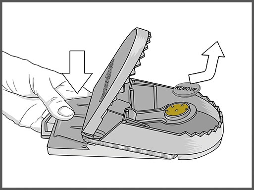 1. Jednoduše stiskněte páčku dolů a odstraňte ochranný kryt návnady . Past na krysy SuperCat je nyní připravena k použití.