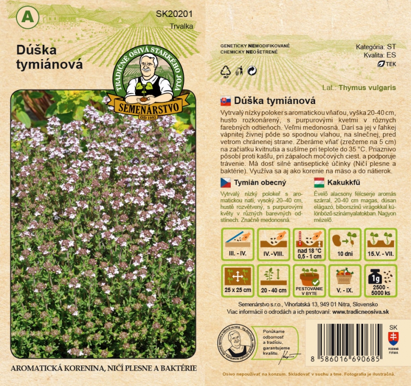 Věkovitý nízký polokeř s aromatickými listy, 20-40 cm vysoký, hustě větvený, s fialovými květy v různých barevných odstínech. Velmi medonosný. Prospívá v lehké, vápenité, na živiny bohaté půdě se spodní vlhkostí, na slunné, před větrem chráněné straně. Sklízíme nať (seříznutou na 5 cm) na začátku kvetení a sušíme při teplotě do 35 °C. Působí blahodárně při kašli, infekcích močových cest a podporuje trávení. Má poměrně silné antiseptické účinky (ničí plísně a bakterie). Používá se také jako koření do masa a pomazánek.