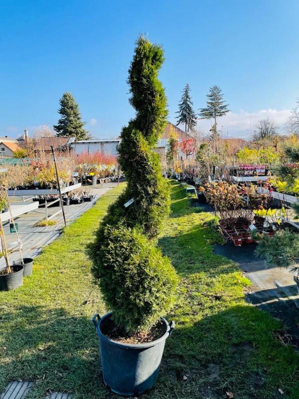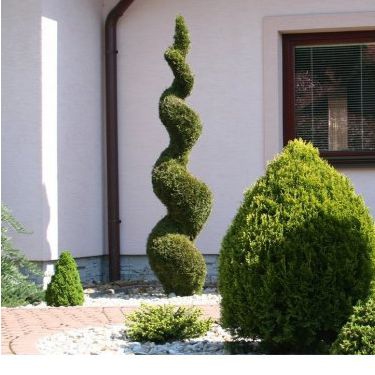 Tuja spirálovitého tvaru je vhodná jako solitér v květináči u dveří, ale také jako nápadná rostlina ve výsadbě.