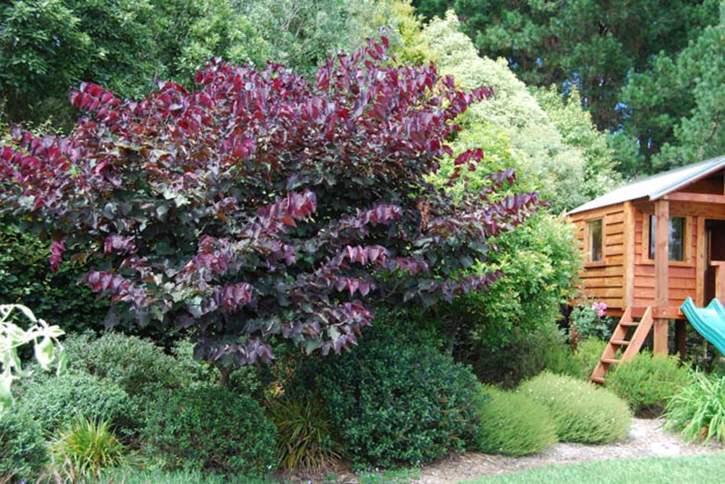 Jedná se o větší keř nebo menší strom, který dorůstá výšky až 3 m. V případě, že se jedná o větší strom, je možné, že se bude jednat o větší keř. Květy mají růžovofialovou barvu. Daří se mu na plném slunci,ale snese i polostín. Je opadavý a dává přednost vzdušné a vlhké půdě. Listy jsou lesklé, vínově červené. Kvete velmi bohatě.