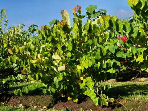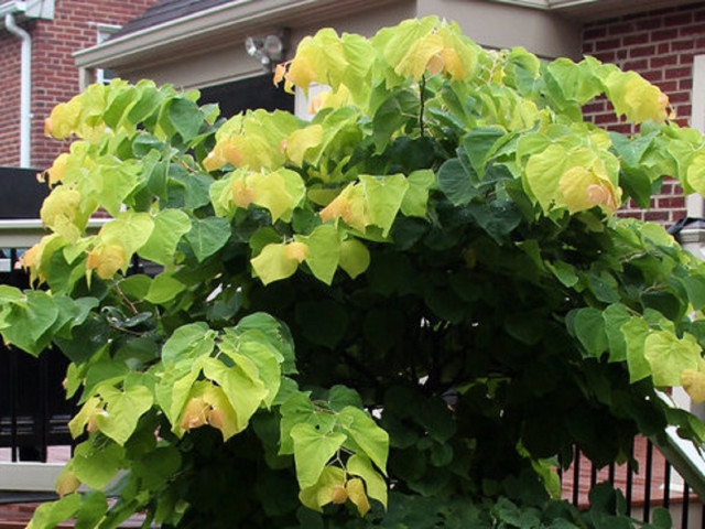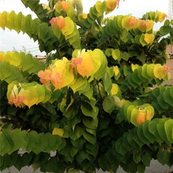 ´RISING SUN´ pochází z USA, kde ji v roce 2003 jako náhodnou sazenici objevili Ray a Cindy Jacksonovi z Jackson Nurseries v Belvidere, Tennessee. Zdobí ji jedinečně zbarvené velké listy, které vyrůstají v zářivě zlatavě oranžové barvě, která směrem dovnitř tmavne tak, že každý list je jinak zbarvený, jako byste skládali pastelky podle barev a sytosti - od zlatavě oranžové přes žlutavou, žlutozelenou, limetkově zelenou až po středně zelenou. Jsou opadavé, široce srdčité, 10-14 cm dlouhé a široké a na podzim se krásně zbarvují do červena a žluta. Brzy na jaře se na miniaturních stoncích přímo na dřevě objevují drobné, zářivě růžové květy.