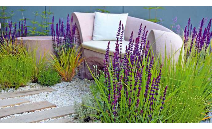 V tomto záhone sú iba tri druhy trvaliek, pričom hlavnú úlohu má odolná Perovskia. Pokiaľ sa javí ako slabá, menej rozkonárená, môžete ju na jar zostrihnúť až na 5-10 cm. Je to vynikajúca trvalka, ktorá láka do záhrady množstvo motýľov a včiel.